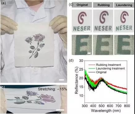 研究者利用空气雾化器,将PVA粘合剂添加到二氧化硅胶体微球分散液,在基底上均匀地雾化沉积非晶光子晶体结构色涂层。PVA有效地打断了胶体微球形成的长程有序结构,形成均匀的非晶结构,产生无角度依赖的结构色。通过选择150-300纳米不同尺寸的微球,可以得到覆盖可见光范围的各种不同颜色。研究者通过掩模板辅助在白色蚕丝面料上制备出复杂的彩色玫瑰花图案。PVA的添加同时还大大地提高了非晶结构色涂层的力学性能。丝绸面料保留了原有的柔韧性,并且经过多次拉伸涂层也不发生脱落。参照纺织品的色牢度测试标准,研究者进行多次水洗与摩擦测试,发现这种涂层仍然具有较好的颜色稳定性和结构完整性。这些研究表明通过后期改进粘结技术及批量化制备工艺,这种雾化沉积的方法将会在纺织印染领域具备较好的应用前景。