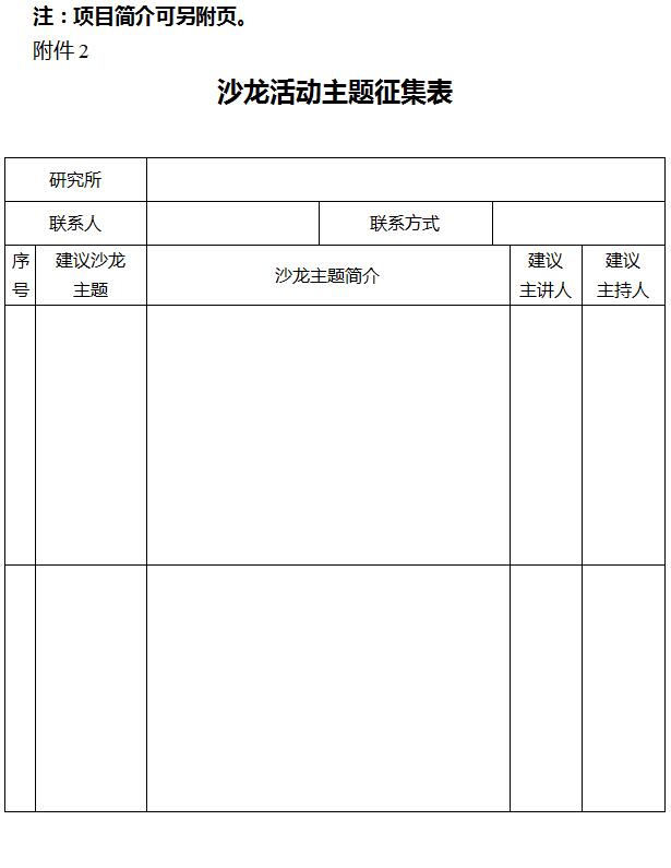 技术交易市场将针对最新技术动态、技术转移经验分享、创新创业辅导、产业化模式交流、政策解析等内容开展主题沙龙活动,旨在为研究所与企业、投资人、专家学者等搭建交流沟通的平台,碰撞思想的火花。为此,现向各专业研究所集中征集沙龙活动主题。各研究所可以结合本所相关活动,提出2-3个沙龙主题建议,并于2015年12月25日前将沙龙主题征集表报送至总院技术转移部。总院技术转移部根据各所报送的沙龙主题进行遴选后统筹安排。