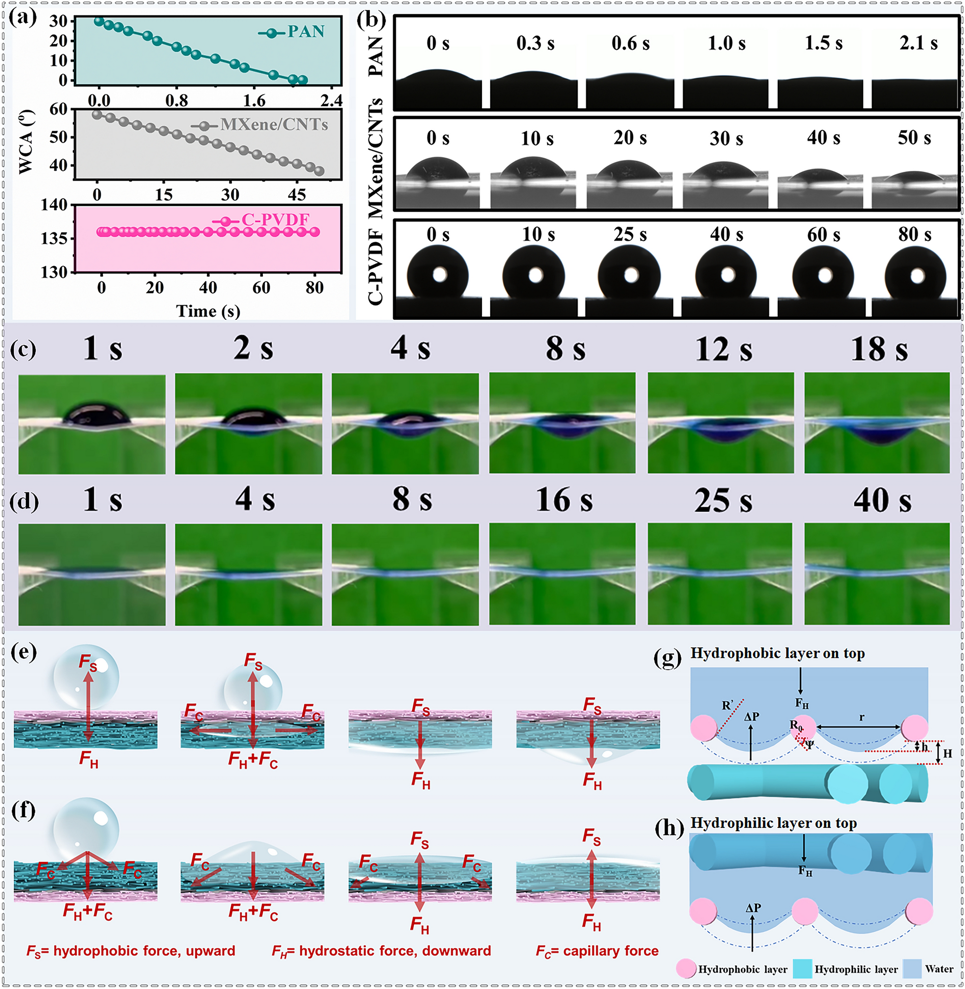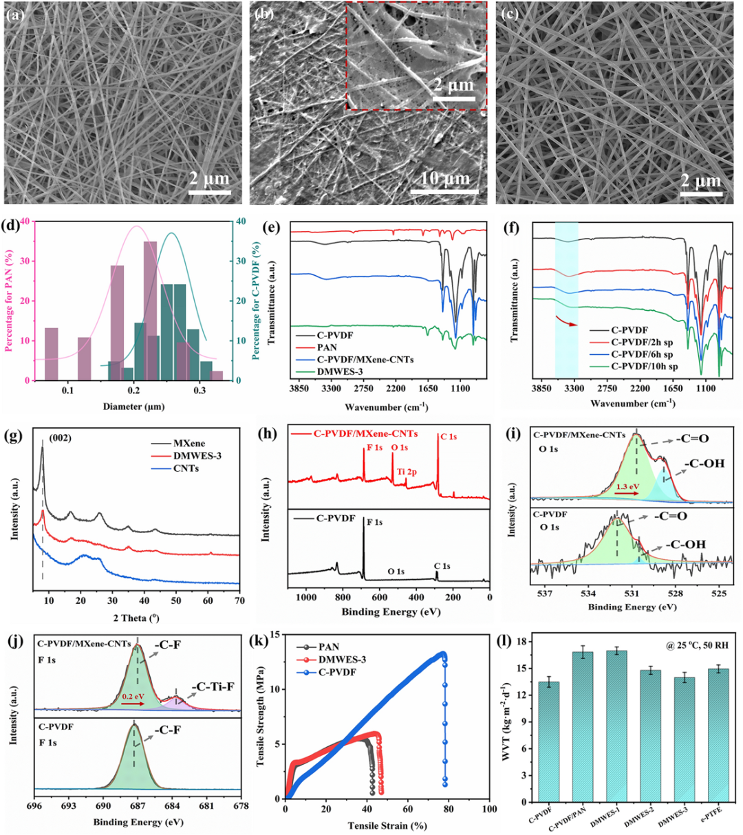 香港城市大学胡金莲教授团队通过仿生设计,利用静电纺丝技术制备出了一种具有定向吸湿排汗功能的电子皮肤(DMWES),其由CNT改性PVDF纳米纤维的疏水层和PAN纳米纤维的亲水层组成,中间夹有电喷涂MXene/CNT导电油墨,通过明显的疏水-亲水差异诱导的表面能梯度成功实现了单向水分转移,可以自发地从皮肤吸收汗液并确保生物电信号的稳定性。